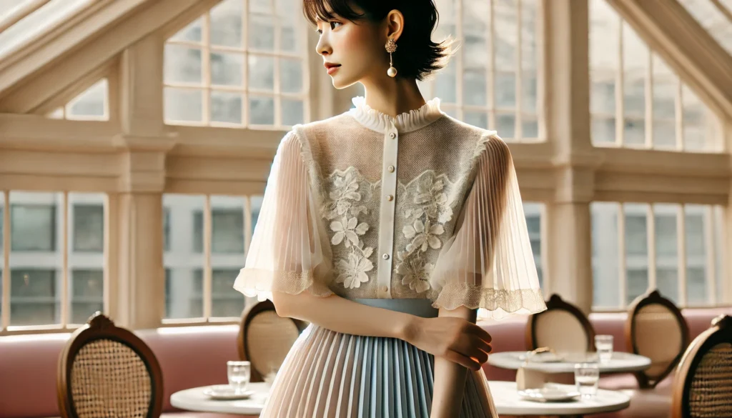 私がこれまでの出演ドラマや雑誌の衣装をリサーチした結果、彼女のスタイルにはいくつかの共通点が見えてきました。まず、トップスにはレースや透け感のあるシフォン素材、あるいは控えめなフリルがあしらわれたブラウスを選ぶことが多いです。これは、彼女の華奢な上半身(骨格ウェーブ)をふんわりとカバーしつつ、顔周りに華やかさをプラスする効果があります。