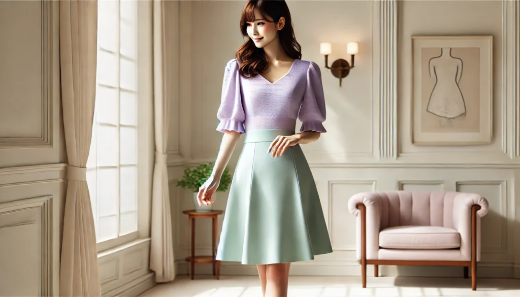 ボトムスに関しては、タイトスカートよりも、Aラインに広がるフレアスカートやプリーツスカートを合わせている姿をよく目にします。歩くたびに揺れる裾が、彼女の持つ「儚げな空気感」をより一層強調してくれるんですよね。色はやはり、パーソナルカラーである「ブルベ夏」に調和する、ラベンダー、アイスブルー、オフホワイト、ネイビーといった寒色系やパステルカラーが中心です。