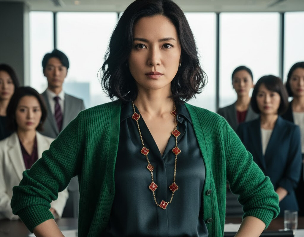 視聴者の視線が釘付けになったのは、ドラマ第1話で、主人公がグリーンのニットカーディガンという印象的な衣装に合わせて着用していた、胸元で鮮烈な赤色を放つネックレスでした。