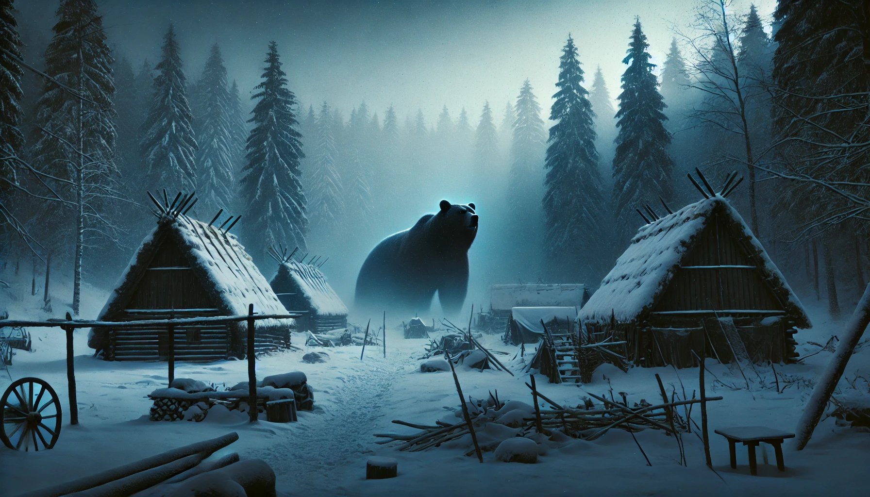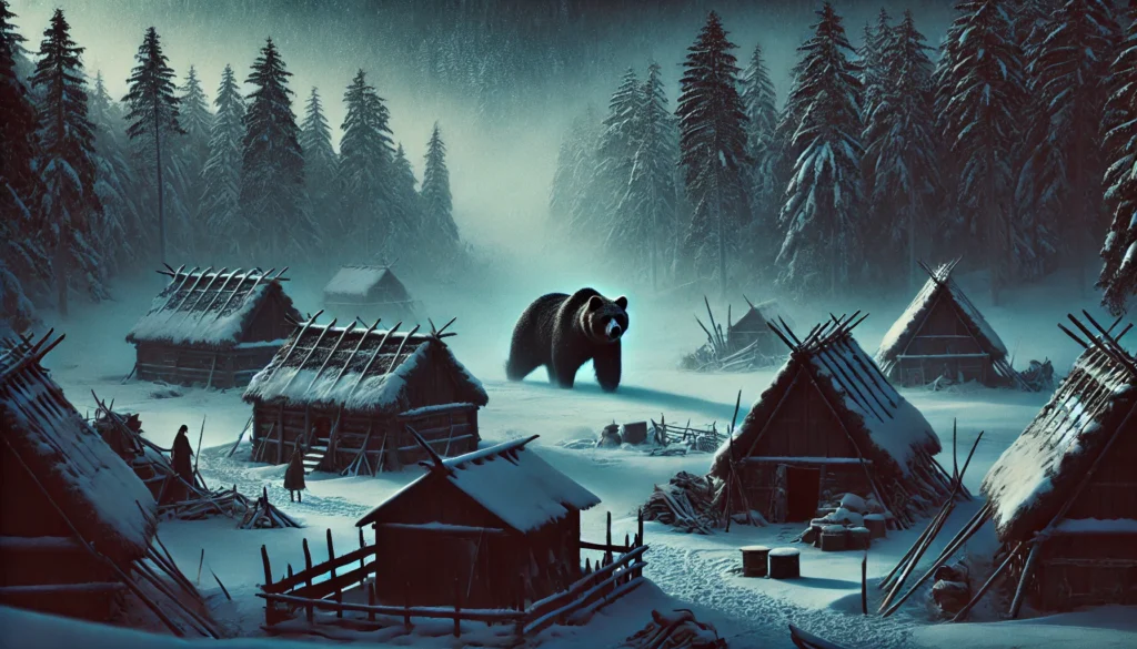 大正4年(1915年)の12月に起きた史実の三毛別羆事件でも、事件を引き起こしたのは冬眠し損ねて凶暴化した「穴持たず」と呼ばれる状態の巨大なヒグマでした。厳しい冬の寒さと極限の飢えに苛まれた猛獣は、通常の生態からは考えられないほど攻撃的になります。この加害個体は体長が2.7メートル、体重が380キログラムにも達したと推測されており、そんな規格外の巨獣が、か弱き開拓民たちの住む質素な茅葺き小屋を次々と打ち破って侵入してきたのです。暗闇の中から突然現れるその姿は、まさに現実に具現化したウェンカムイそのものだったでしょう。